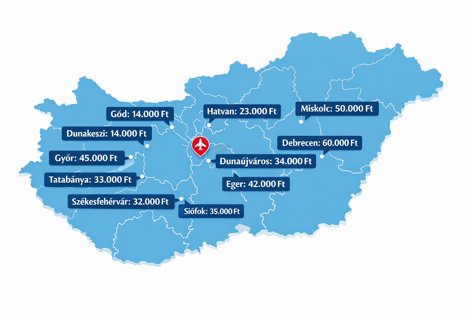 Göd: 14.000 Ft Dunakeszi: 14.000 Ft Debrecen: 60.000 Ft Dunaújváros: 34.000 Ft Eger: 42.000 Ft Győr: 45.000 Ft Hatvan: 23.000 Ft Miskolc: 50.000 Ft Siófok: 35.000 Ft Székesfehérvár: 32.000 Ft Tatabánya: 33.000 Ft