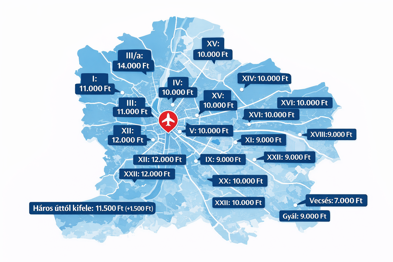 I: 11.000 Ft II: 12.000 Ft III/a: 14.000 Ft III: 11.000 Ft IV: 10.000 Ft V: 10.000 Ft VI: 10.000 Ft VII: 10.000 Ft VIII: 9.000 Ft IX: 9.000 Ft X: 9.000 Ft XI: 12.000 Ft XII: 12.000 Ft XIII: 10.000 Ft XIV: 10.000 Ft XV: 10.000 Ft XVI: 10.000 Ft XVII: 9.000 Ft XVIII: 9.000 Ft XIX: 10.000 Ft XX: 10.000 Ft XXI: 10.000 Ft XXII: 12.000 Ft Háros úttól kifele: 11.500 Ft + 1500 Ft XXIII: 10.000 Ft